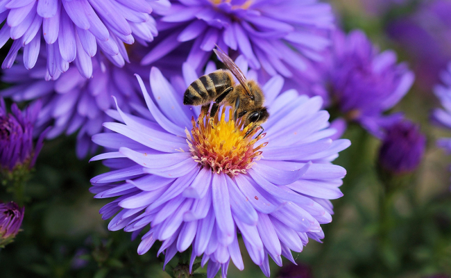 Description: Les asters d’automne sont des plantes vivaces herbacées de culture très facile et qui s’adaptent à la plupart des sols sans excès. Leur hauteur varie énormément en fonction des cultivars et des géniteurs. Les descendants d’Aster novi-belgii sont généralement plus petits que ceux issus d’Aster novae-angliae. Parmi les hybrides, il existe des variétés naines idéales pour les bordures, des variétés moyennes pour les premiers plans des massifs de vivaces et des variétés de grande taille pour l’arrière-plan des mixed-border. En moyenne, la hauteur se situe aux alentours de 1,2 m. Un autre caractère distingue les deux principaux géniteurs. Il concerne la pilosité des feuilles. L’aster de la Nouvelle-Belgique (également appelé aster de Virginie) possède des feuilles lisses ou glabres tandis que l’aster de la Nouvelle-Angleterre est à feuilles très nettement pubescentes. Leur floraison en capitules de type radié s’effectue en septembre-octobre d’où le nom de marguerite de la StMichel (ce saint est fêté le 29 septembre). Les abeilles butinent activement les fleurs du disque central, jaune orangé, où elles récoltent du nectar et du pollen. De nombreux akènes munis d’une aigrette soyeuse succèdent aux fleurs. Ils seront disséminés par le vent et parfois seront à l’origine d’une début de naturalisation voire d’invasion de l’espèce.