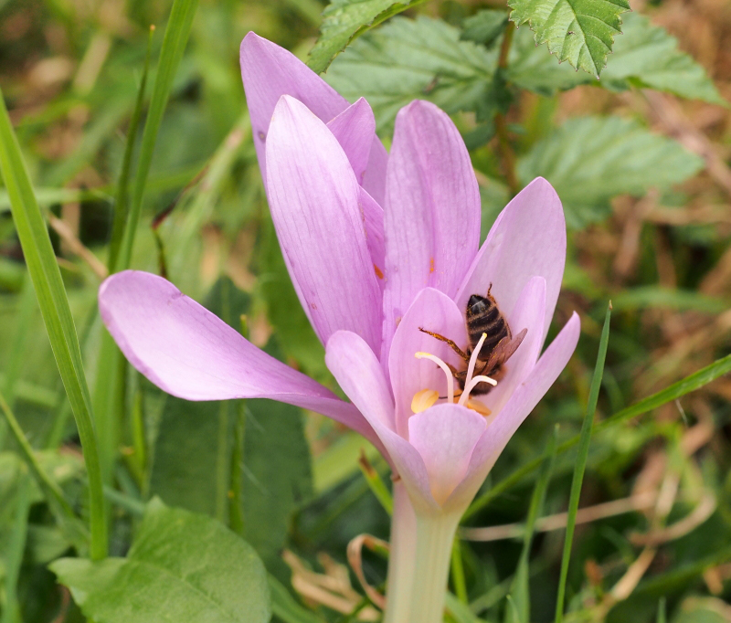 Le saviez-vous ? La colchicine est l’alcaloïde très toxique que contiennent toutes les parties de la plante. A faible dose, ce poison est utilisé dans le traitement spécifique de la goutte, maladie chronique du métabolisme de l’acide urique. En biologie, la colchicine est utilisée pour contrarier la division cellulaire et obtenir des plantes polyploïdes c’est-à-dire dont le nombre des chromosomes est multiplié par 2, 4 et plus. Elles sont généralement plus grosses et plus productives. Lorsqu’on observe les abeilles butiner des fleurs de colchique on les voit récolter du pollen directement au niveau des anthères, du nectar au fond de la coupe florale mais aussi lécher les tépales. Dans le langage des fleurs, le colchique d’automne est le symbole de la jalousie