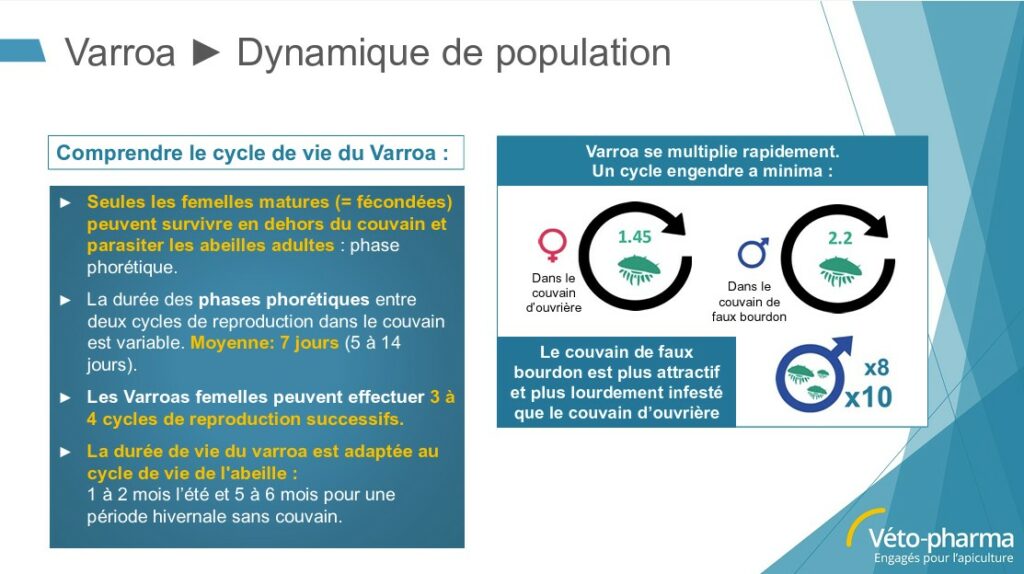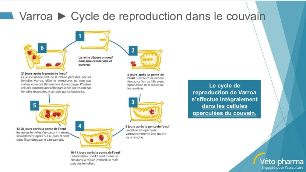 Tout d’abord, son mode d’action est bien connu. Les varroas se reproduisent dans le couvain operculé d’abeilles, puis se disséminent dans la colonie d’abeilles en les affaiblissant et en leur transmettant virus et maladies.