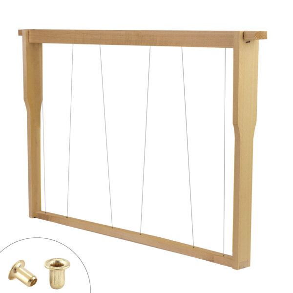 Ce cadre Hoffmann 37 mm en bois à fils verticaux est conçu pour un corps de ruche Dadant. Ses trous perforés sont renforcés avec des œillets pour prévenir le cisaillement du bois.