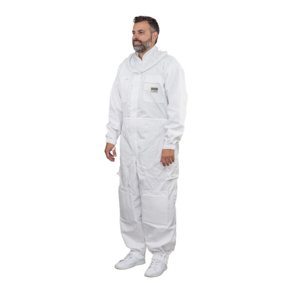 Sa matière en poly coton lisse est choisie pour que les abeilles ne puissent pas s’y agripper. Pour plus de confort et de résistance, des protections matelassées ont été ajoutées sur les genoux. L’intérieur du buste et des manches est doublé en maille, ce qui favorise une meilleure circulation de l’air et empêche le tissu de coller à la peau, garantissant ainsi une protection efficace contre les piqûres. Entièrement adaptable, elle dispose d’un tour de taille réglable, de poignets ajustables et de bandes élastiques sous les chaussures pour un maintien parfait.