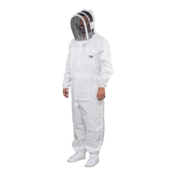 Chaque détail de cette combinaison a été pensé pour la pratique apicole. Le voile intégral est maintenu à distance du visage par une armature rigide et légère, vous offrant un large champ de vision et une protection maximale. Une languette de réglage permet un ajustement précis. Pour plus de praticité, le voile peut basculer complètement vers l’arrière ou être retiré pour le nettoyage. De plus, ses multiples poches, deux sur la poitrine et deux poches basses, vous permettent de garder vos outils indispensables comme le lève cadre toujours à portée de main.