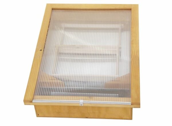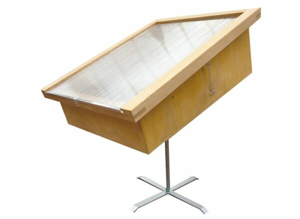 Ce modèle est fabriqué en bois, lui assurant une grande longévité. Son atout majeur réside dans son pied pivotant, une fonctionnalité ingénieuse qui vous permet d’orienter facilement le cérificateur pour suivre la course du soleil tout au long de la journée, maximisant ainsi son rendement. Le double vitrage améliore l’isolation et la montée en température, garantissant une fonte rapide et complète. Il est livré avec une grille interne pour filtrer les impuretés majeures et un bac destiné à recueillir la cire purifiée.