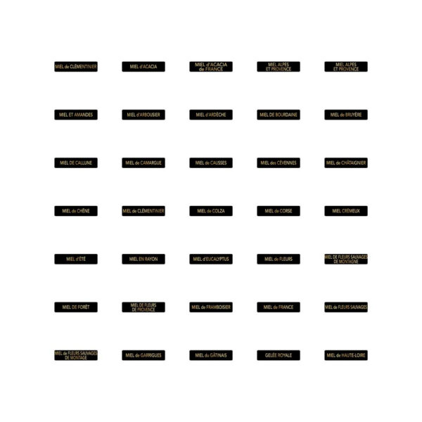 Habillez vos pots de miel avec nos étiquettes adhésives d’appellation rectangulaires au format 12 x 50 mm. Disponibles avec écriture or sur fond noir, elles offrent plus de 70 modèles différents pour identifier précisément le type ou l’origine de votre miel, ainsi que d’autres produits de la ruche.