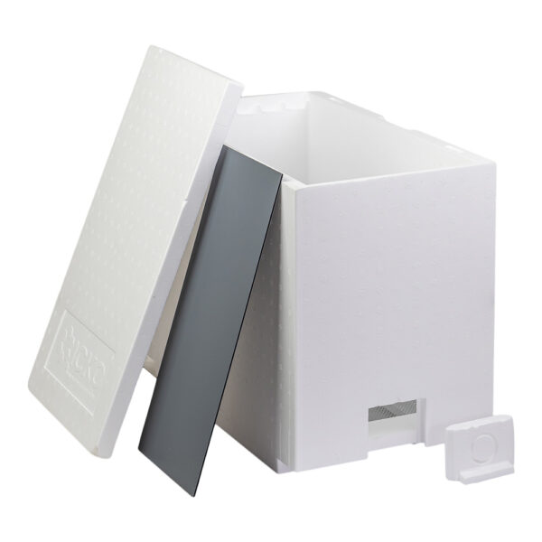 - Composition : Corps monobloc avec crémaillères et bandes inter cadres moulées, fond intégré aéré, couvercle polystyrène