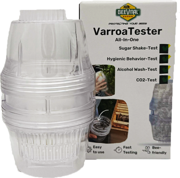 Notre VarroaTester vous aide à évaluer l’infestation de Varroa sur les abeilles adultes (acariens phorétiques). Nous recommandons le test au sucre glace car il est respectueux des abeilles et les acariens tombés sont faciles à voir dans le sucre glace.